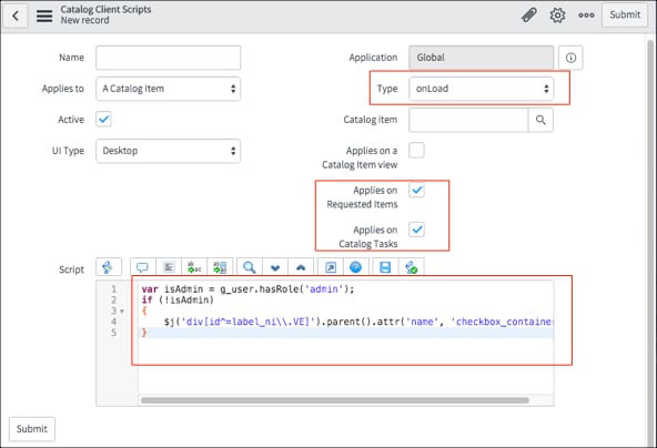 Upgrading to one of the versions where the issue is fixed is your best bet, but if you cannot upgrade at this time, we have a workaround. Follow the steps below to create an onLoad catalog client script that applies only to RITM and Catalog Task.