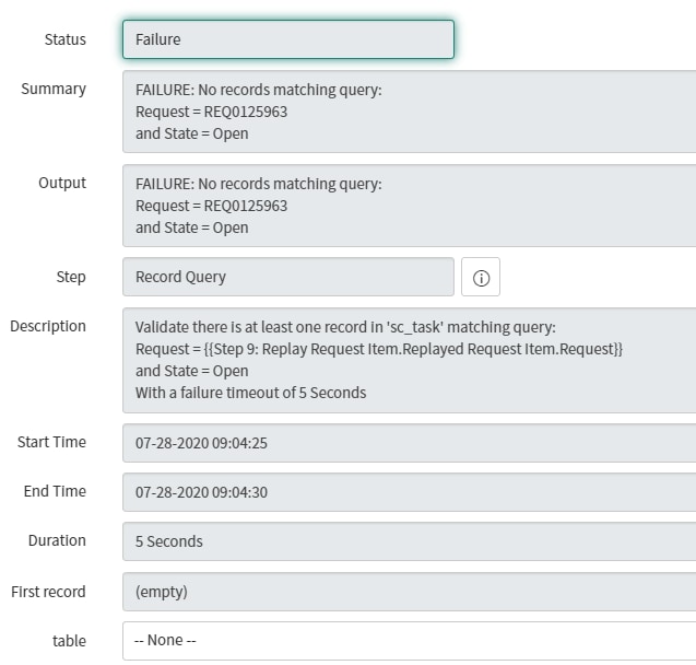 It fails at Step 15. I am trying to do a Record Query to get back the sc_task and close the task, but the error I keep getting is "No records matching query" as shown below: