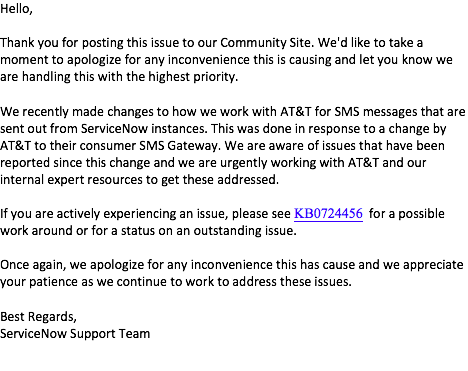 Since it only seems to affect our ServiceNow notifications I can only assume that its a ServiceNow-specific problem with AT&T. And if that assumption is correct then I suspect it may be impacting a lot of you all as well. We rely heavily on text messages for our high priority incidents so this is kind of critical for us. Please let me know if you've encountered this or if you have any ideas on how to resolve it. And before anyone suggests that we just use the Notify plugin for direct SMS messaging through Twilio, we don't own that and its not in the budget.
