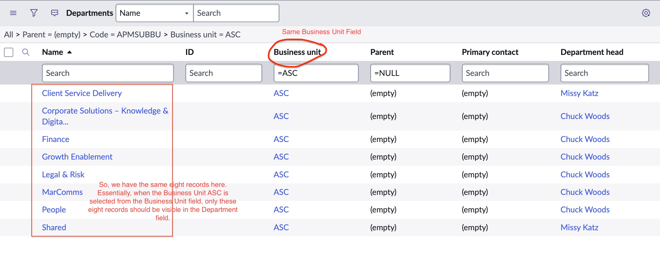 When a user selects a Business Unit in the cmdb_ci_business_app form, the Department field should display only those departments that are associated with that selected Business Unit.