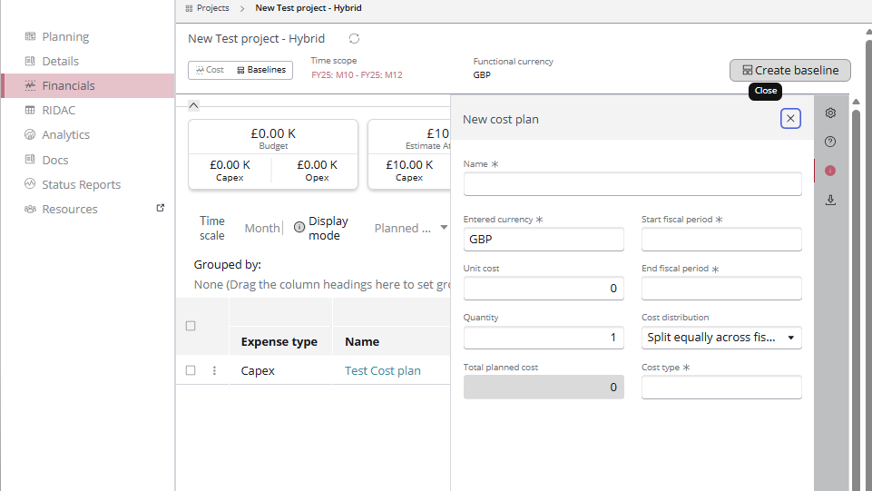 Additional cost plan fields in Project Planning console