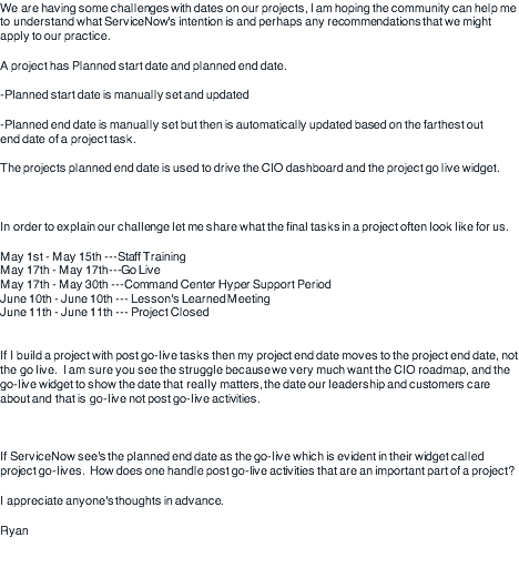 If I build a project with post go-live tasks then my project end date moves to the project end date, not the go live. I am sure you see the struggle because we very much want the CIO roadmap, and the go-live widget to show the date that really matters, the date our leadership and customers care about and that is go-live not post go-live activities.