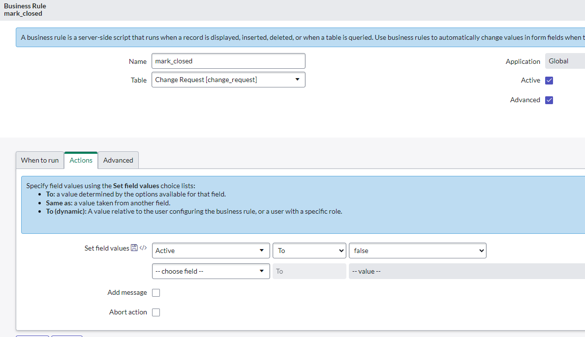 I came across a scenario where, when Normal Change Requests are closed, through the business rule "mark_closed" the CR is auto updated to Active - 'False';