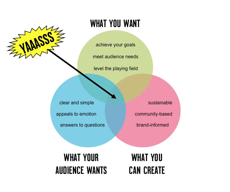 If you are operating in the middle where what you need, what people want, and what you can create overlap, the end result will be the most efficient and effective content for the consumer.