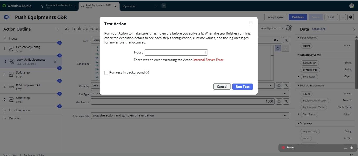 I’m working in Flow Designer and I’m getting an error when testing my Flow/Action, specifically in a Look Up Records step where I use a Condition Script (encoded query).