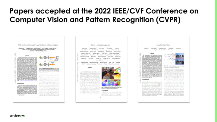 The 2022 IEEE/CVF Conference on Computer Vision and Pattern Recognition (CVPR)will take place from June 19-24, 2022 in New Orleans, Louisiana. The Conference is planned to be held in person, with an online option offered to those who cannot travel. First held in 1985, CVPR has become the premier annual computer vision event for the brightest minds in the field, attracting participation and collaboration across industry and academia.  We are excited to announce that, in partnership with external collaborators, researchers from the ServiceNow Research Low-Data Learning program team will present their papers at the main conference. Low Data Learning studies Machine Learning methods that enable adapting efficiently to varied and changing datasets. ServiceNow Research focuses on a wide range of downstream tasks such as language understanding, computer vision, robotic automation, and learning workflows. Papers accepted to the main conference: