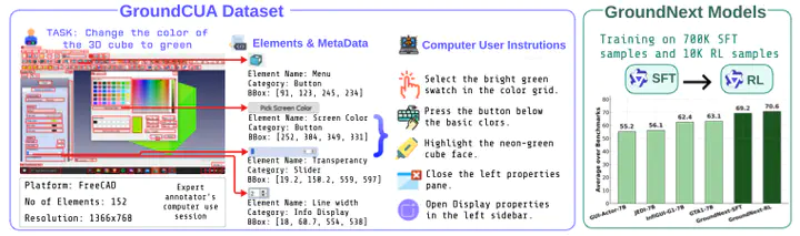 Building reliable computer-use agents requires grounding: accurately connecting natural language instructions to the correct on-screen elements. While large datasets exist for web and mobile interactions, high-quality resources for desktop environments are limited. To address this gap, we introduce GroundCUA, a large-scale desktop grounding dataset built from expert human demonstrations. It covers 87 applications across 12 categories and includes 56K screenshots, with every on-screen element carefully annotated for a total of over 3.56M human-verified annotations. From these demonstrations, we generate diverse instructions that capture a wide range of real-world tasks, providing high-quality data for model training. Using GroundCUA, we develop the GroundNext family of models that map instructions to their target UI elements. At both 3B and 7B scales, GroundNext achieves state-of-the-art results across five benchmarks using supervised fine-tuning, while requiring less than one-tenth the training data of prior work. Reinforcement learning post-training further improves performance. These results demonstrate the critical role of high-quality, expert-driven datasets in advancing general-purpose computer-use agents.