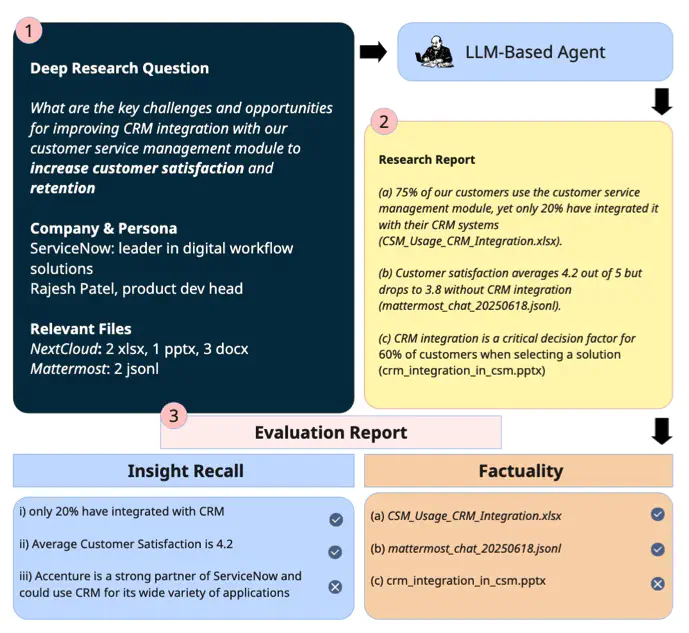 We introduce DRBench, a benchmark for evaluating AI agents on complex, open-ended enterprise deep research tasks. Unlike existing benchmarks focused on surface-level or web-only queries, DRBench assesses an agent’s ability to resolve deep research tasks, which includes resolving high-level queries such as “What changes should we make to our product roadmap to ensure compliance?’’ These tasks are grounded in specific user personas (e.g., product developer) and company contexts (e.g., the ServiceNow organization), and require agents to search across diverse applications accessing both public and private data, reason over heterogeneous formats like spreadsheets, PDFs, websites, and databases, and synthesize their findings into an insightful report. We contribute (1) a suite of complex deep research tasks inspired by ServiceNow spanning three domains: CRM, Strategic Portfolio Management, and Compliance; (2) a realistic enterprise environment composed of several common applications like chat, cloud file system, emails and more; (3) a task generation methodology to generate quality deep research questions and insights grounded on real world web facts and synthesized local facts; and (4) a lightweight evaluation mechanism to score agents’ reports in terms of whether the dominant insights have been extracted and whether the insights in the reports are well-cited. Our experiments benchmark current deep research agents across different methods, revealing performance gaps and observations that would inspire future enterprise deep research agents.